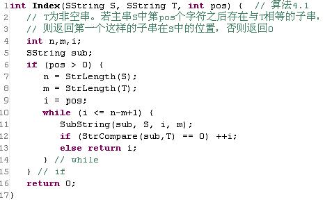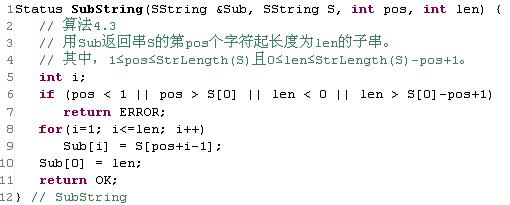 可以使用C语言中的字符数组来表示SString结构,不过需要注意的是数据从下标1的单元开始存储。由于C语言中的字符串是以最后一个为'\0'来标定字符串结尾,同时也没有存储字符串长度。因而算法4-3中的Sub[0]=len应当改为Sub[len+1] = '\0';