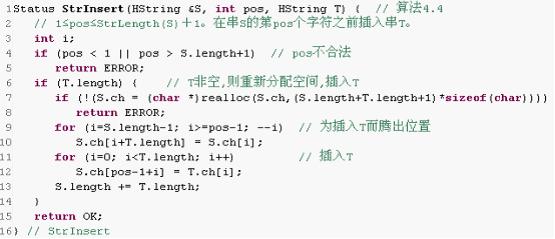 由于HString是由字符指针和整数构成,因而其结构和操作相对比较简单。但是,对于输入,可能需要多余的操作了。首先使用C字符串来获取字符串,然后获得输入字符串的长度,然后再分配内存。分配的长度要比输入的字符串的长度大1,你知道的。同时上述算法插入时也要注意字符串结尾(上述算法需要补充)。