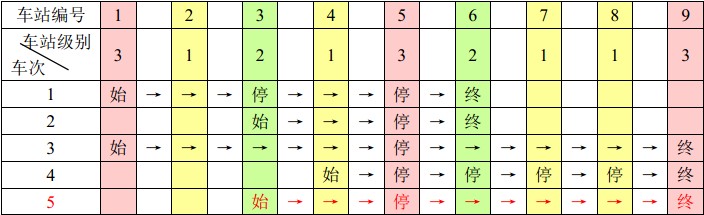 例如,下表是5趟车次的运行情况。其中,前4趟车次均满足要求,而第5趟车次由于停靠了3号火车站(2级)却未停靠途经的6号火车站(亦为2级)而不满足要求。