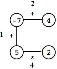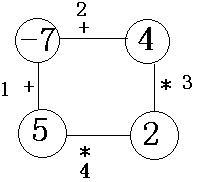 多边形(Polygon)游戏是单人玩的游戏,开始的时候给定一个由N个顶点构成的多边形(图1所示的例子中,N=4),每个顶点被赋予一个整数值,而每条边则被赋予一个符号:+(加法运算)或者*(乘法运算),所有边依次用整数1到N标识。