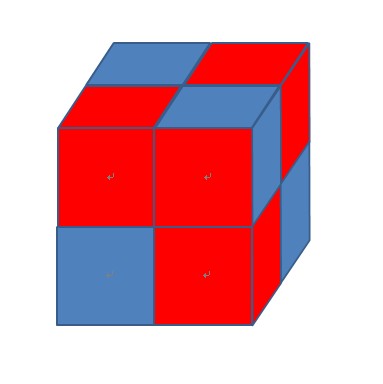 Flabby is addicted to Rubik’s cube. He has many kinds of Rubik’s cube and plays them well. He can reorder a Rubik’s cube in a few seconds. He is famous for playing Rubik’s cube and attracts many young girls. One of his friends, Ant, is jealous of him and decides to let him be embarrassed in public. Ant makes a small Rubik’s cube by himself. This small magic is 2*2*2 and is drawn in blue and red, as shown in Figure 1.