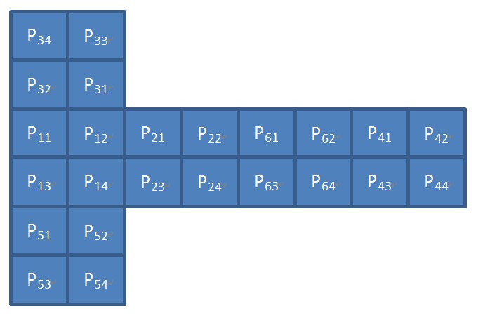 In the input file, the first line is an integer T which is the number of test case. For each test case, there is 6 lines of integers describe the Rubik’s cube. For each line, there are four integers. Pij which is shown in Figure 3 corresponds to the jth integer of the ith line. If Pij is 0, it means the corresponding place is red. If Pij is 1, it means the corresponding place is blue.