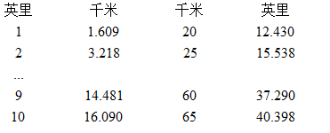 输出所输入的数据英里与千米之间的互换后的结果。其中每个表格每行数字之间空一个Tab位,两个表格之间空两个Tab位,格式如下: