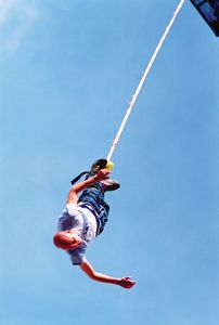 where w is his weight in kilograms and 9.81 is the Earth acceleration in meters over squared seconds. - Mr. Bond falls freely until the rope tautens. Then the force with which the bungee rope pulls him back into the sky depends on the current length of the rope and is
