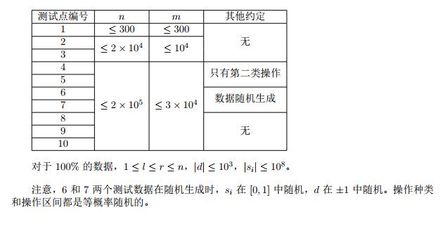 1) 输入 l, r, d,对于所有 l ≤ i ≤ r,将 s[i] 修改为 s[i] + d,注意 d 可能是负数。