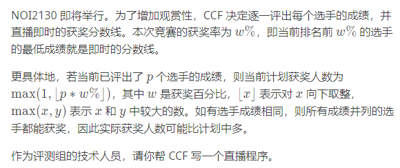 第一行有两个整数 n w 分别代表选手总数与获奖率。