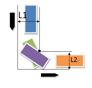 他们不确定是否可以让这个箱子通过这个拐角。当然,经常玩博弈的他们肯定不会傻到再把这个箱子搬回去,经过他们的精确度量,发现拐角处入口的宽度是L1,出口的宽度是L2。现在A&B用如图所示的旋转搬箱子的办法,让箱子可以尽可能的通过拐点,问他们这种办法是否可以成功。