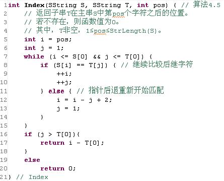 书中的算法思想是这样的:分别利用计数指针i和j指示主串S和模式串T中当前正待比较的字符位置。算法的基本思想是:从主串S的第pos个字符起和模式的第一个字符比较之,若相等,则继续逐个比较后续字符,否则从主串的下一个字符起再重新和模式的字符比较之。依次类推,直至模式T中的每个字符依次和主串S中的一个连续的字符序列相等,则称匹配成功,函数值为和模式T中第一个字符相等的字符在主串中的序号,否则称匹配不成功,函数值为零。
