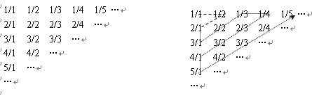 我们以Z字形给上表的每一项编号。第一项是1/1,然后是1/2,2/1,3/1,2/2,…