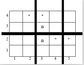 第一行包含K个整数,a1a2……aK,表示第a1行和a1+1行之间、第a2行和第a2+1行之间、…、第aK行和第aK+1行之间要开辟通道,其中ai< ai+1,每两个整数之间用空格隔开(行尾没有空格)。 第二行包含L个整数,b1b2……bk,表示第b1列和b1+1列之间、第b2列和第b2+1列之间、…、第bL列和第bL+1列之间要开辟通道,其中bi< bi+1,每两个整数之间用空格隔开(行尾没有空格)。