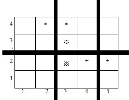 输入的第一行,有5各用空格隔开的整数,分别是M,N,K,L,D(2< =N,M< =1000,0< =K< M,0< =L< N,D< =2000)。 接下来D行,每行有4个用空格隔开的整数,第i行的4个整数Xi,Yi,Pi,Qi,表示坐在位置(Xi,Yi)与(Pi,Qi)的两个同学会交头接耳(输入保证他们前后相邻或者左右相邻)。 输入数据保证最优方案的唯一性。