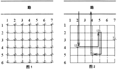 例如在图2所示的花生田里,只有位于(2,5),(3,7),(4,2),(5,4)的植株下长有花生,个数分别为13,7,15,9。沿着图示的路线,多多在21个单位时间内,最多可以采到37个花生。