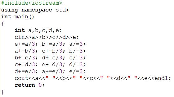 输出一行,五个整数(分别表示5个小朋友的剩余糖果数)