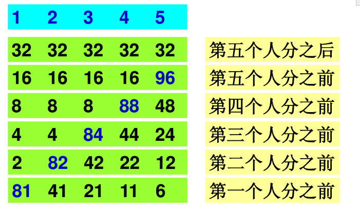 五位好朋友相聚。每一位朋友带来了很多巧克力豆赠送给各位朋友,使每个人的巧克力豆在各自原有基础上翻了一倍;接着第二位好友也同样向每人赠送巧克力豆,他同样使每人的巧克力豆在各人已有数量上翻了一倍;第三、四、五位好朋友都照此办理。经过这样的赠送之后,每人的巧克力豆又恰好都相等,都为n颗。问各位好友原先的巧克力豆数量分别是多少?