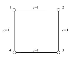 和4号结点之间的最短路又有2条。因而根据定义,1号结点的重要程度计算为1/2+1/2=1。由于图的对称性,其他三个结点的重要程度也都是1。