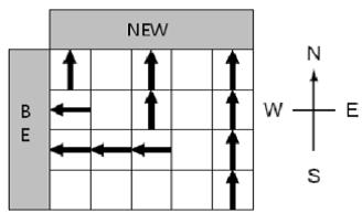 另外这些矿物都十分不稳定,因此它们在运送过程中都不能拐弯。这就意味着如果某个格子上建有南北向管道,但是它北边的格子建有东西向管道,那么这根南北向管道内运送的任何东西都将丢失。迚一步地,运到NEW矿收集站的BE矿也会丢失,运到BE矿收集站的NEW矿也会丢失。输入