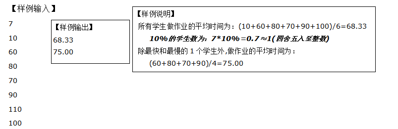 第2行只有一个整数,表示除去10%最多时间和10%最少时间的学生后,所有合法填写学生做作业的平均时间;