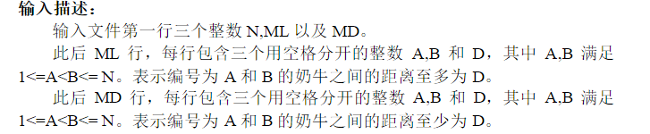 某些奶牛之间互相喜欢,它们希望互相之间的距离至多为一个定值。某些奶牛之间互相厌恶,它们希望互相之间的距离至少为一个定值。现在给定ML个互相喜爱的奶牛对以及它们之间距离的最大值,MD个互相厌恶的奶牛对以及它们之间距离的最小值。
