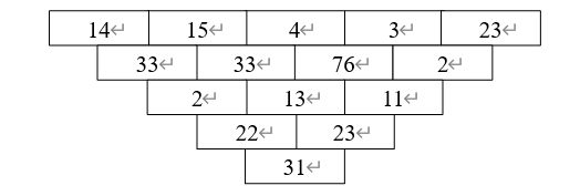 在一个凹槽中放置了n层砖块,最上面的一层有n块砖,第二层有n-1块,……最下面一层仅有一块砖。第i层的砖块从左至右编号为1,2,……i,第i层的第j块砖有一个价值a[ij](a[ij]<=50)。下面是一个有5层砖块的例子: