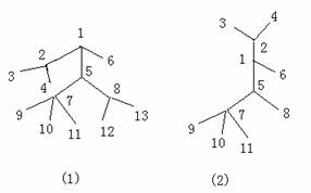 对于一棵树,我们可以将某条链和与该链相连的边抽出来,看上去就象成一个毛毛虫,点数越多,毛毛虫就越大。例如下图左边的树(图 1 )抽出一部分就变成了右边的一个毛毛虫了(图 2 )。