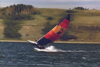 Heeling can also be mitigated by having the crew sit or stand on, or even hike out beyond, the windward hull. If you look carefully at the picture you can see the two person crew hiking to windward.