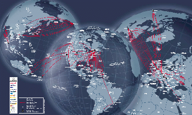 Airplanes fly close to the Great Circle Route between two cities. The Great Circle Route is the shortest arc concentric with the earth that joins the two cities; that is, the shortest distance between the two cities following the surface of the earth.