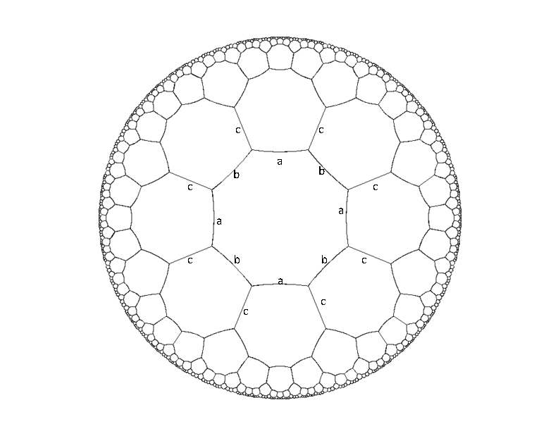 Below is a picture of an infinite hyperbolic tessellation of octagons. If we think of this as a graph of vertices (of degree three), then there exists an isomorphism of the graph which maps any vertex x onto any other vertex y. Every edge is given a label from the set {a,b,c} in such a way that every vertex has all three types of edges incident on it, and the labels alternate around each octagon. Part of this labeling is illustrated in the diagram.