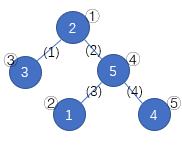 如上图,蓝圈中的数字 1∼51 \sim 51∼5 一开始分别在结点②、①、③、⑤、④。按照 (1)(4)(3)(2) 的顺序删去所有边,树变为下图。按数字顺序得到的结点编号排列为①③④②⑤,该排列是所有可能的结果中字典序最小的。