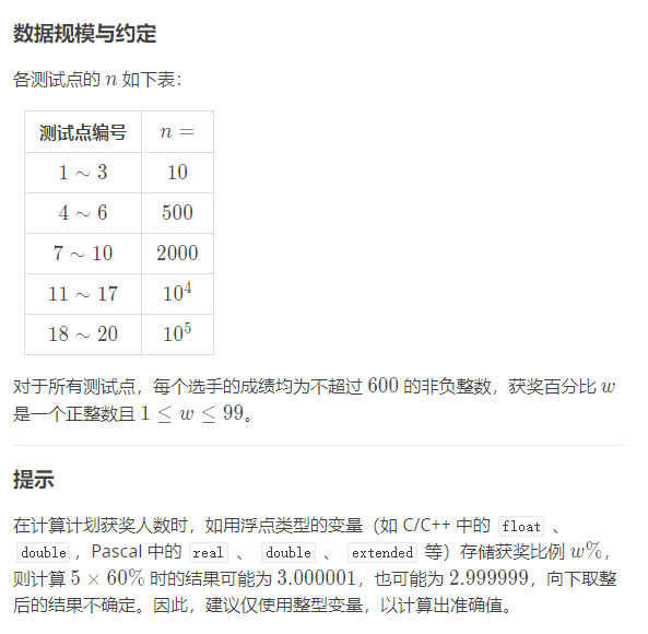 第一行有两个整数 n w 分别代表选手总数与获奖率。